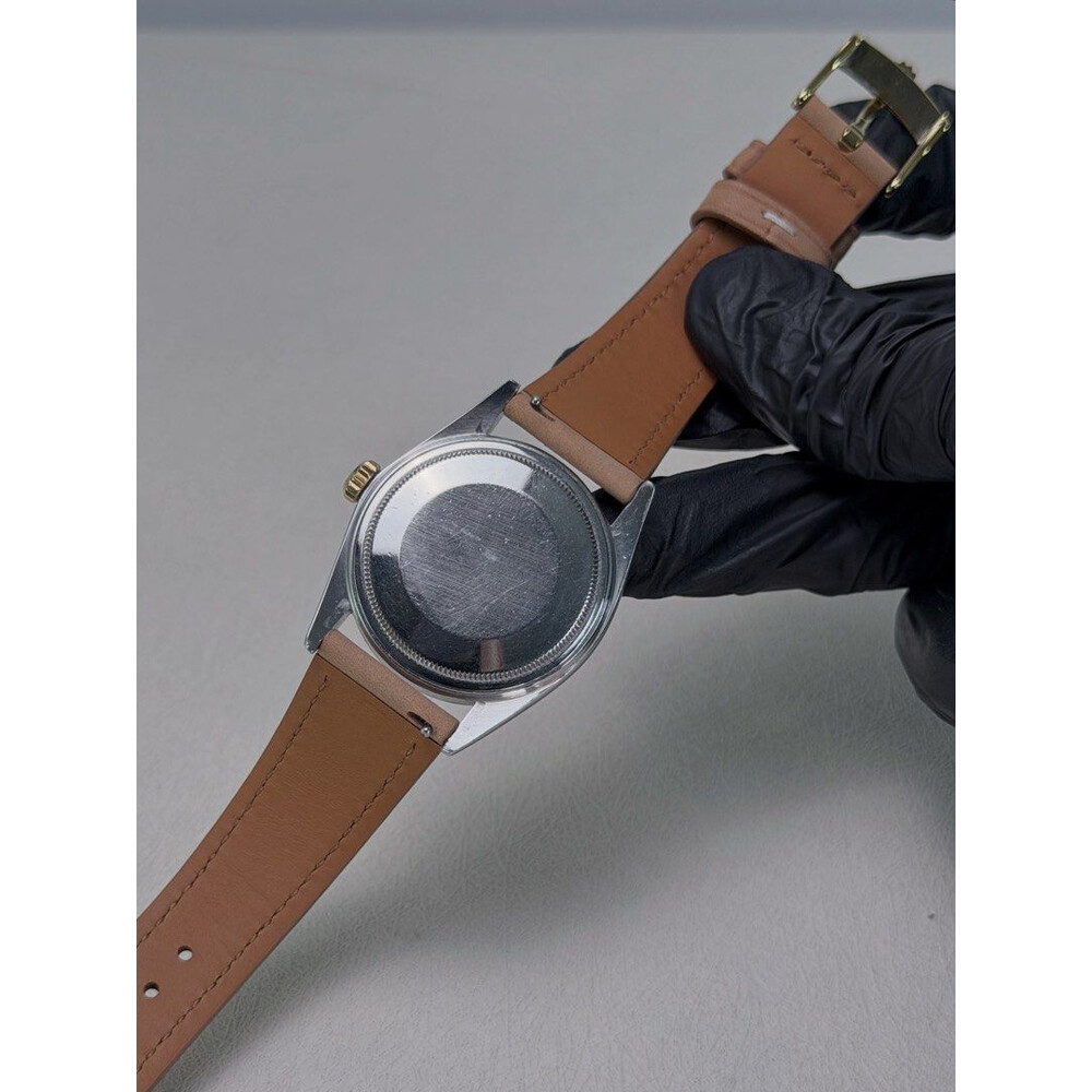 Its steel case and yellow-gold fluted bezel give the watch a warmer, more extroverted presence than earlier all-steel references. The champagne dial is period-correct and quintessentially late-1970s Rolex, balancing legibility with quiet luxury.
